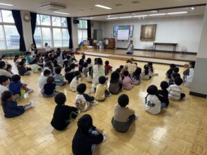 ホールに集まり朝の体操をしてから節分についてお話を聞きました!