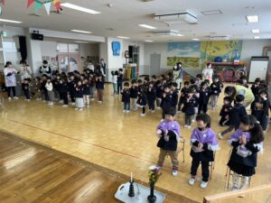 12月22日は2学期最終日でした。冬休みを元気に楽しく過ごせるようにお話を聞いたり2学期終業式をしました。